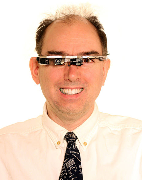 史蒂夫·曼恩,1962年出生,今年50多了。早年求學(xué)于MIT,理學(xué)學(xué)士,工學(xué)碩士,1997年拿到了媒體藝術(shù)博士學(xué)位,F(xiàn)在在多倫多大學(xué)當(dāng)教授,在電器與計算機工程系,藝術(shù)與科學(xué)系各種跨界地牛掰閃亮著。 別看他這么逗樂,實在人家被業(yè)界尊為“可穿著技術(shù)之父”。上個世紀(1999年)就開始帶著圖中的EyeTap眼鏡四處拉風(fēng)。2012年吃麥當(dāng)勞時,還由于帶著這樣酷炫的裝備被人打過,在當(dāng)時引起了全球范圍的對于谷歌眼鏡類型硬件的大討論。 他在動圖里曬的就是自己發(fā)明的三大神器:EyeTap眼鏡,智能腕表,和SWIM連續(xù)波形打印的AR技術(shù)。 曼恩主要的科技成就集中在計算機攝影技術(shù)方面:1993年,曼恩就第一次提出了“視頻軌道”算法;還發(fā)明過使用高壓液壓流體發(fā)生的樂器(好比,你可以表演彈個“水”); 上世紀八九十年代,曼恩開發(fā)了CLI(命令行界面)和GUI(圖形用戶界面),均屬于通過與現(xiàn)實世界的天然動作進行交互的方法。后來還開發(fā)了HCI基于聲樂的人機交互技術(shù)。 其總體的開發(fā)思路也是很光鮮,瞄準人類的各種天然行為研發(fā)交互技術(shù),并且越做越精細。 假如說這是一個“搶大神,變身獨角獸”的時代,那么上圖左側(cè)笑地低調(diào)的Steve Feiner也被Meta集齊了。 史蒂夫·費納是哥大計算機系的教授,2014年獲得了IEEE VGTC電氣電子工程師學(xué)會可視化和圖形技術(shù)委員會會議評比的虛擬現(xiàn)實終身成就獎。 1996年他利用可穿透的顯示屏創(chuàng)建第一個戶外可移動增強現(xiàn)實系統(tǒng)。其設(shè)計的The Private Eye頭部佩戴顯示器利用一個可擺動的鏡子,掃描虛擬場景里垂直的LED陣列。探測屏幕對角線長度為1.25英寸,不外圖像會顯示在18英寸間隔遠的15英寸屏幕上。