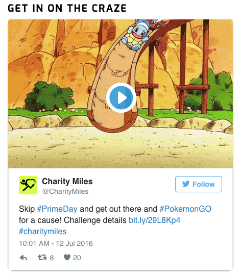 2. 別忘了,Pokémon GO還可以是今年最佳健身類APP 假如你的公司正好深耕于人們的運動健康數(shù)據(jù)的挖掘或是像微公益一樣為公益捐步數(shù),那么Pokémon GO將為你提供極大的助益。要知道Pokémon GO的玩家都走得超級多,他們得到四處抓精靈,走2KM/5KM 的路,只是為了孵精靈蛋。難怪會有人說這是今年最佳的健身類APP,究竟國外為了抓小精靈天天走10公里當即瘦下10公斤的勵志故事已經(jīng)發(fā)生。而Charity Miles就是一家專門人們的行走、步行或騎自行車的里程轉(zhuǎn)化為捐款的APP,