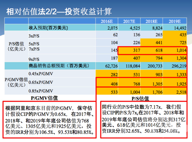 拋開理念和定性的分析,新美大(CIP)吸引潛伏投資方的故事是:未來新美大(CIP)的估值或市值還有非常大的增長空間,可以讓投資人高價退出。新美大(CIP)對標了阿里、京東、聚美等公司,用了市銷率(P/S)和P/GMV兩種估值模型。