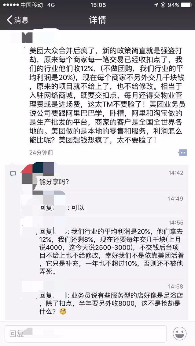 團(tuán)長(zhǎng)君不由迷惑。這豈非是新美大各項(xiàng)業(yè)務(wù)整合尚未完全結(jié)束,就開(kāi)始從店家嘴里爭(zhēng)食? 回望去年互聯(lián)網(wǎng)領(lǐng)域,合并案風(fēng)氣云涌,但是合并之后,整合之中發(fā)生什么題目,對(duì)市場(chǎng)產(chǎn)生了什么樣的實(shí)際效應(yīng),外界卻鮮有分析。從近期美團(tuán)點(diǎn)評(píng)合并之后產(chǎn)生出來(lái)的種種效應(yīng),我們嘗試著從一個(gè)并購(gòu)案例,看出互聯(lián)網(wǎng)合并對(duì)市場(chǎng)產(chǎn)生的各種端倪。 我們先來(lái)看看這件“美甲店被強(qiáng)收費(fèi)”是怎么回事,為了更加客觀(guān)地了解事情緣由,首席觀(guān)察團(tuán)獨(dú)家采訪(fǎng)了這位美甲店老板。 在當(dāng)事人的要求下,我們暫且以G先生稱(chēng)呼他。G先生家的美甲店開(kāi)在三線(xiàn)城市,每年均勻到店消費(fèi)的客戶(hù)分為老顧客和被美團(tuán)團(tuán)購(gòu)業(yè)務(wù)吸引來(lái)的客戶(hù)。“我們店開(kāi)了快十六年,與美團(tuán)合作是去年一家新店開(kāi)張時(shí)才合作的。實(shí)際上,美團(tuán)帶來(lái)的客戶(hù)都是很便宜的客戶(hù),成為會(huì)員的很少,最優(yōu)質(zhì)和不亂的客戶(hù)都不是美團(tuán)帶來(lái)的。美團(tuán)的客戶(hù)主要是圖便宜,客質(zhì)事實(shí)上是很差的。與美團(tuán)合作,我們主要是為了鋪客量。” G先生表示,整個(gè)美甲行業(yè)的均勻利潤(rùn)率是20%,百分之八十的同行在這兩年利潤(rùn)下降都極其嚴(yán)峻,美團(tuán)的新政策無(wú)疑讓本來(lái)利潤(rùn)淡薄的美甲行業(yè)更加雪上加霜。“兩家合并后,收12%的抽成,這本身就不公道。” G先生頗無(wú)奈地說(shuō),“大約十天左右前,新美大溘然來(lái)了撥新的業(yè)務(wù)員,跟我講要抽取每年4000元的用度。這幾天又來(lái)催我,交2000元。假如不交,店面在網(wǎng)站上的信息就不予更改調(diào)整。”G先生表示,這太令人生氣了。“十幾二十塊錢(qián)的團(tuán)購(gòu)生意,還被剝這么多層皮,我們整個(gè)行業(yè)還要不要活了?!” 截止到團(tuán)長(zhǎng)君聯(lián)系G先生,他表示可能因?yàn)榕笥讶κ┱沟挠绊懥,新美大的人打電?huà)過(guò)來(lái)了解了情況,并把網(wǎng)站上拖了半個(gè)月不給修改的店面信息修改了。但用度仍是照收不誤。 實(shí)際上,涉及新美大壟斷的相關(guān)事件一直被多行業(yè)職員爆料吐槽。 今年1月,武漢爆發(fā)KTV行業(yè)對(duì)新美大的集體抵制。
