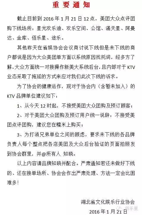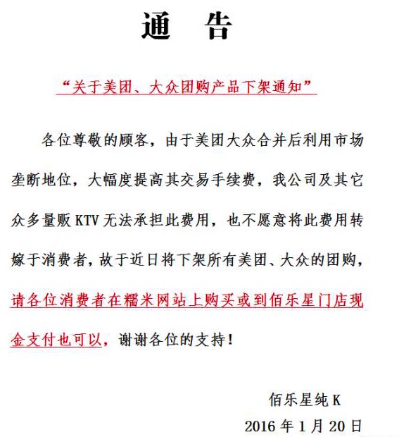 動(dòng)靜是從一個(gè)名為“省娛協(xié)會(huì)商討群”的微信聊天截圖爆出來(lái)的,當(dāng)事者為武漢KTV商家表示,新美大合并后,將原來(lái)的手續(xù)費(fèi)由2%漲到12%,商家在討論群里集體表示,在團(tuán)購(gòu)的影響下,業(yè)務(wù)利潤(rùn)已經(jīng)很低了,再多收取抽成點(diǎn),獲得收益甚至不足以支撐基本糊口。