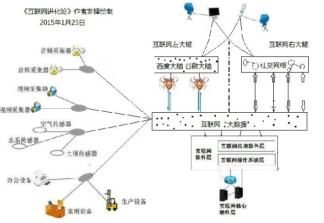 4.2014年繪制出“互聯網大腦的左右大腦結構圖”,提出以搜索引擎為出發(fā)點的百度大腦,谷歌大腦等互聯網人工智能系統(tǒng)將進化成為互聯網的左大腦,以Facebook,QQ,微信為代表的社交網絡正在形成互聯網的右大腦.“