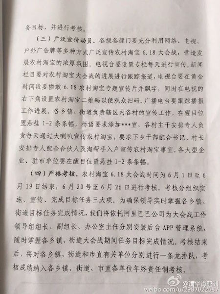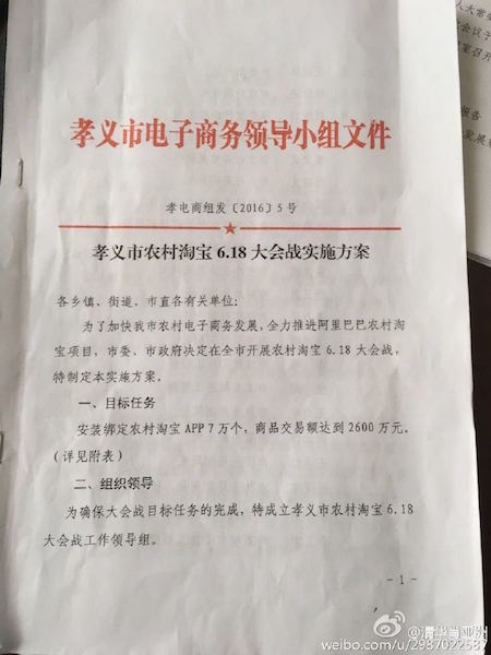 當(dāng)前,競(jìng)爭(zhēng)日趨慘烈的“6.18”大戰(zhàn)終于落下帷幕,各大電商平臺(tái)紛紛曬出自己的“成績(jī)單”。根據(jù)農(nóng)村淘寶宣布的數(shù)據(jù),家電類產(chǎn)品在今年618期間銷量最佳,農(nóng)村淘寶好像已儼然成為家電數(shù)碼產(chǎn)品下鄉(xiāng)的主陣地。 然而,在阿里村淘看似繁榮的營(yíng)銷數(shù)據(jù)背后,卻躲藏著行政干涉干與這只怪手。據(jù)傳,山西孝義市近期就發(fā)布了一份令人咋舌的文件,要求下級(jí)單位配合完成阿里村淘6.18交易額等指標(biāo)。 一、為推進(jìn)阿里村淘項(xiàng)目,孝義市強(qiáng)制向下攤派消費(fèi)指標(biāo) 日前,網(wǎng)絡(luò)上曝出一份山西省孝義市電子商務(wù)領(lǐng)導(dǎo)小組下發(fā)的紅頭文件,引來網(wǎng)友的廣泛關(guān)注和吐槽。文件內(nèi)容顯示,該市要求下級(jí)單位完成農(nóng)村淘寶在6.18期間的APP安裝量和交易額指標(biāo)。 詳細(xì)來看,孝義市擬定在2016年6月1日至19日期間,完成“安裝綁定農(nóng)村淘寶APP 7萬個(gè),商品交易額達(dá)到2600萬元”的目標(biāo)任務(wù)。為此,孝義市將指標(biāo)細(xì)化后,對(duì)市委、宣傳部等機(jī)關(guān)及企事業(yè)單位下發(fā)了明確的任務(wù)指標(biāo),甚至轄下的各鄉(xiāng)鎮(zhèn)、礦區(qū)和學(xué)校都被分配了上百、上千的APPA綁定任務(wù)。 同時(shí),孝義市要求各鄉(xiāng)鎮(zhèn)、街道和市直有關(guān)單位分別進(jìn)行一條龍排隊(duì),考核成績(jī)納入年終責(zé)任制考核?己艘劳邪⒗锇桶凸緸榇髸(huì)戰(zhàn)工作領(lǐng)導(dǎo)組組長(zhǎng)、副組長(zhǎng)、辦公室主任分別安裝后臺(tái)APP治理系統(tǒng),隨時(shí)把握各單位任務(wù)目標(biāo)完成情況。