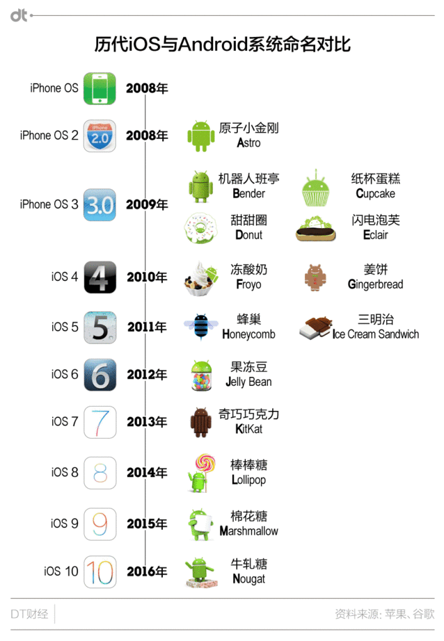 好吧,別告訴我你當真讀完了。 DT君給不喜歡句讀的你來翻譯一下:這不是iOS所以我并不關(guān)心安卓取什么名字,以及我不分單詞有關(guān)系嗎…… 好的,DT君不是故意要用iOS擁躉來黑安卓黨的,咳咳。因此下面這些信息,足以撫慰安卓黨們受傷的心靈。 移動系統(tǒng)命名PK:安卓呆萌小甜心,蘋果板著臉數(shù)數(shù) DT君臆測,泛博蘋果用戶和使用著“改良”過的安卓系統(tǒng)的中國用戶,對安卓原生系統(tǒng)的命名方法并不認識。 實在從2009年5月開始,安卓系統(tǒng)就開始使用甜點來作為版本代號,這些版本按照大寫字母的順序來進行命名,目前最新版本輪到了N。在此之前,谷歌曾經(jīng)用過原子小金剛(Astro)和機器人班亭(Bender)這種不明覺厲的名字,之后就越來越接地氣——不包括最新的牛軋?zhí)堑脑,從C開始安卓已經(jīng)使用了11個甜品進行命名。 谷歌為這些版本都制作了雕塑。但是DT君覺得,看著身穿谷歌T恤的程序員,爭先恐后和甜甜圈、三明治們合影,畫面卻有些詭異。 至于為什么選了這么個方法進行命名,谷歌發(fā)言人沒有給出任何清晰的理由:“這就似乎某種內(nèi)部團隊的事情,我們想做的有點——怎么說——有點神秘。” 這樣的命名風格就和這個安卓機器人一樣,顯得活潑但又有點“脆弱”,與蘋果對其移動系統(tǒng)IOS的命名比擬,風格迥異。下面這張圖,足以說明題目:
