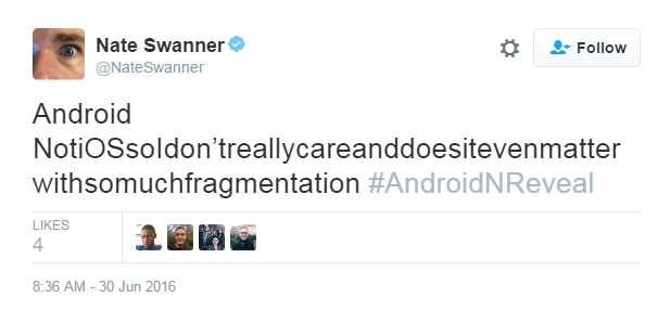 在各種候選名字中,Nutella(能多益)——這款意大利廠商Ferrero生產(chǎn)的聞名巧克力榛子醬受到很多用戶的支持,但未能終極被選中,據(jù)說還傷了不少網(wǎng)友的心。 除此之外,還有很多被網(wǎng)友寄予厚望的名字也慘遭淘汰,如印度網(wǎng)友提交的Neyyappam,這是一種來自印度的流行小吃甜點,用大米和粗黃糖通過油炸制成;再好比New York Cheesecake”(紐約芝士蛋糕),這一度是谷歌內(nèi)部研發(fā)Android N的代號。 再好比下面這個: