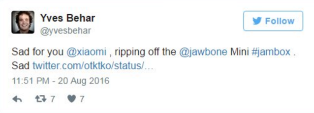 近日,小米副總裁雨果·巴拉在接受國外媒體采訪時透露,小米很快將在美國開售智能手機。然而,手機還沒開始賣,小米藍牙音箱就被Jawbone以為是抄襲了他們的產(chǎn)品。 Jawbone首席運營官、Fuseproject首席設計師伊夫斯·貝哈爾在Twitter上直接@小米,稱小米方盒子藍牙音箱抄襲了自家的Jawbone Mini Jambox音箱的設計,并且對小米的行為感到悲哀。