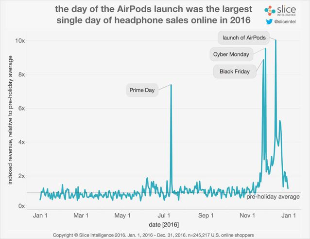 蘋果公司CEO Tim Cook在2016年12月底,對發(fā)售尚不滿一個月的AirPods銷量表示滿足,以為AirPods是大獲成功的產(chǎn)品,不外由于蘋果公司沒有宣布數(shù)據(jù),除了eBay上有人加價出售AirPods的側(cè)面信息證實AirPods的確受歡迎外,分析師也無法判定AirPods的詳細銷售情況。 市場調(diào)研公司Slice Intelligence近日發(fā)布的講演證明了Tim Cook的說法,AirPods一個月的時間占據(jù)了26%的市場份額,可以說蘋果公司的品牌和眾多iOS用戶改變了無線耳機市場的格式。在AirPods發(fā)售之前,蘋果此前花費30億美元收購的Beats之前占據(jù)市場24.1%的份額,排名第一,緊隨其后的是占10.5%的Bose耳機,以及占7.8%的Plantronics耳機。 從數(shù)據(jù)感慨感染下AirPods是多么受歡迎: