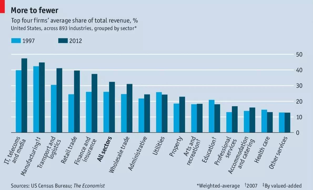 收入的不平等進(jìn)一步加重 盡管如此,別的專家的研討還顯現(xiàn),跟著市場(chǎng)集中度越來越高,市場(chǎng)位置高的公司越來越強(qiáng),草創(chuàng)公司取得成功的才能也更加降低。因?yàn)閷?duì)折新增就業(yè)崗位都發(fā)源自成功的草創(chuàng)公司,這種狀況也按捺了新就業(yè)時(shí)機(jī)的發(fā)生。 彼得·歐爾薩格(Peter Orszag)曾在《彭博視角》(Bloomberg View)節(jié)目撰文指出,超級(jí)明星公司取得遠(yuǎn)超正慣例劃的出資報(bào)答,進(jìn)一步加重收入上的不平等,也就家常便飯了。歐爾薩格與貝拉克·奧巴馬(Barak Obama)總統(tǒng)任內(nèi)的經(jīng)濟(jì)參謀委員會(huì)主席賈森·富爾曼(Jason Furman)一起指出,本錢報(bào)答率的進(jìn)步并沒有帶來對(duì)公司出資添加——這是獨(dú)占力氣構(gòu)成的另一表現(xiàn)。 反獨(dú)占滯后 有些芝加哥學(xué)派成員對(duì)此表明附和。該學(xué)派是現(xiàn)代反獨(dú)占理論的源頭。20世紀(jì)70到80年代,芝加哥大學(xué)的一群專家經(jīng)過論辯顛覆了反獨(dú)占法。他們以為,并購(gòu)發(fā)生的經(jīng)濟(jì)效率進(jìn)步,其好處足以跨越對(duì)公司規(guī)劃的任何憂慮。例子觸及消費(fèi)者福祉:并購(gòu)是不是給兼并后的公司帶來進(jìn)步消費(fèi)者報(bào)價(jià)的權(quán)利,以及并購(gòu)后職業(yè)準(zhǔn)入門檻是不是會(huì)高到新來者無法輕松跨越的程度?美國(guó)反獨(dú)占法的執(zhí)法者們發(fā)生了不堅(jiān)定。從1970到1999年,美國(guó)每年均勻提交15.7起反獨(dú)占訴訟案。這以后這一數(shù)字一路降低,2000到2014年間降至了缺乏3起。