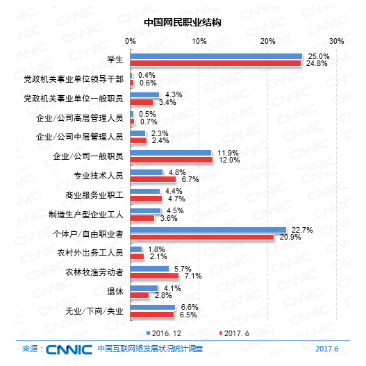 在工作結(jié)構(gòu)上,我國網(wǎng)民中學(xué)生集體占比依然最高,為24.8%;其次為個體戶/自由工作者,份額為20.9%;企業(yè)/公司的管理人員和一般職工占比算計到達(dá)15.1%。