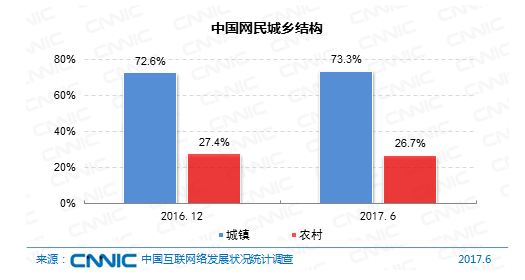 在城鄉(xiāng)結(jié)構(gòu)上,我國網(wǎng)民中農(nóng)村網(wǎng)民占比26.7%,規(guī)劃為2.01億;鄉(xiāng)鎮(zhèn)網(wǎng)民占比73.3%,規(guī)劃為5.50億,較2016年末添加1988萬人,半年增幅為3.7%。