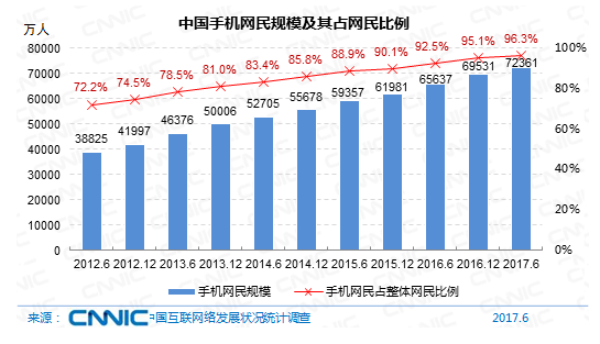 到2017年6月,我國手機(jī)網(wǎng)民規(guī)劃達(dá)7.24億,較2016年末添加2830萬人。網(wǎng)民運用手機(jī)上網(wǎng)的份額由2016年末的95.1%提高至96.3%。