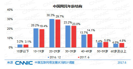 在年紀(jì)構(gòu)成上,我國網(wǎng)民仍以10-39歲集體為主,占全體的72.1%:其間20-29歲年紀(jì)段的網(wǎng)民占比最高,達(dá)29.7%,10-19歲、30-39歲集體占比別離為19.4%、23.0%。與2016年末比較,40歲及以上中高齡集體占比添加1.7個百分點,互聯(lián)網(wǎng)繼續(xù)向這個年紀(jì)集體浸透。