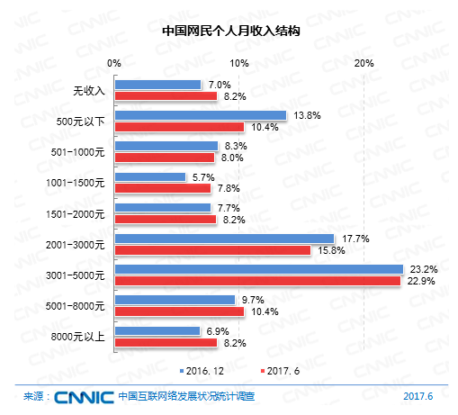 在收入結(jié)構(gòu)上,網(wǎng)民中月收入在2001-3000元及3001-5000元的集體占比較高,別離為15.8%和22.9%。較2016年末,收入在5000元以上的網(wǎng)民人群占比提高了2.1個百分點。
