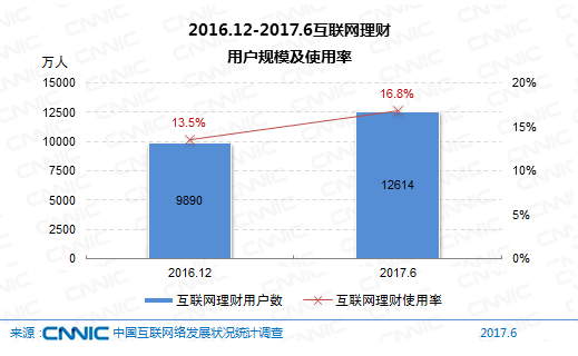 到2017年6月,我國購買互聯(lián)網(wǎng)理財產(chǎn)品的網(wǎng)民規(guī)劃到達(dá)1.26億,較2016年末添加用戶2724萬人,網(wǎng)民運用率從13.5%升至16.8%。