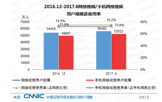 到2017年6月,我國網(wǎng)絡(luò)視頻用戶規(guī)劃達(dá)5.65億,較2016年末添加2026萬人,添加率為3.7%;網(wǎng)絡(luò)視頻用戶運用率為75.2%,較2016年末提高0.7個百分點。其間,手機(jī)視頻用戶規(guī)劃為5.25億,與2016年末比較添加2536萬人,添加率為5.1%;手機(jī)網(wǎng)絡(luò)視頻運用率為72.6%,比較2016年末添加0.7個百分點。