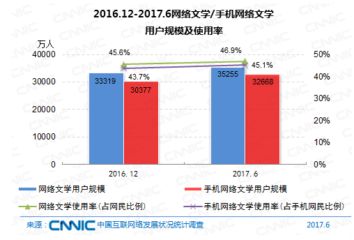 到2017年6月,網(wǎng)絡(luò)文學(xué)用戶規(guī)劃到達(dá)3.53億,較去年末添加1936萬,占網(wǎng)民全體的46.9%,其間手機(jī)網(wǎng)絡(luò)文學(xué)用戶規(guī)劃為3.27億,較去年末添加2291萬,占手機(jī)網(wǎng)民的45.1%。