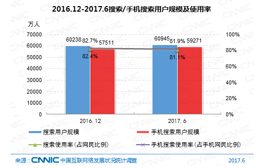 到2017年6月,我國搜索引擎用戶規(guī)劃達(dá)6.09億,運用率為81.1%,用戶規(guī)劃較2016年末添加707萬,添加率為1.2 %;手機(jī)搜索用戶數(shù)達(dá)5.93億,運用率為81.9%,用戶規(guī)劃較2016年末添加1760萬,添加率為3.1%。