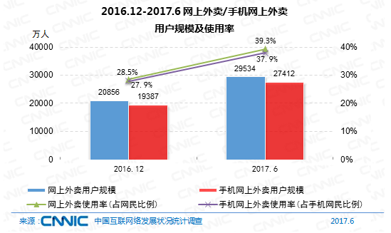 到2017年6月,我國網(wǎng)上外賣用戶規(guī)劃到達(dá)2.95億,較2016年末添加8678萬,添加率到達(dá)41.6%。其間,我國手機(jī)網(wǎng)上外賣用戶規(guī)劃到達(dá)2.74億,添加率為41.4%,運用份額到達(dá)37.9%,提高10個百分點。