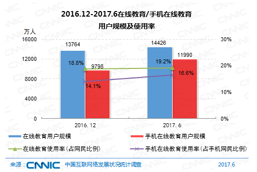 到2017年6月,我國在線教育用戶規(guī)劃達(dá)1.44億,較2016年末添加662萬人,半年添加率為4.8%;在線教育用戶運用率為19.2%,較2016年末添加0.4個百分點。其間,手機(jī)在線教育用戶規(guī)劃為1.20億,與2016年末比較添加2192萬人,添加率為22.4%;手機(jī)在線教育用戶運用率為16.6%,比較2016年末添加2.5個百分點。