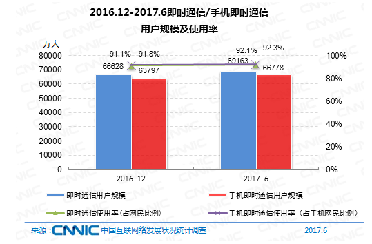 到2017年6月,即時通訊用戶規(guī)劃到達(dá)6.92億,較2016年末添加2535萬,占網(wǎng)民全體的92.1%。其間手機(jī)即時通訊用戶6.68億,較2016年末添加2981萬,占手機(jī)網(wǎng)民的92.3%。