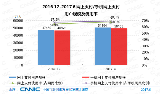 到2017年6月,我國運用網(wǎng)上付出的用戶規(guī)劃到達(dá)5.11億,較2016年12月,網(wǎng)上付出用戶添加3654萬人,半年添加率為7.7%,我國網(wǎng)民運用網(wǎng)上付出的份額從64.9%提高至68.0%。其間,手機(jī)付出用戶規(guī)劃添加迅速,到達(dá)5.02億,半年添加率為7.0%,網(wǎng)民手機(jī)網(wǎng)上付出的運用份額由67.5%提高至69.4%。