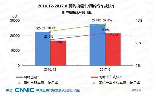 到2017年6月,我國網(wǎng)約出租車用戶規(guī)劃到達(dá)2.78億,較2016年末添加5329萬,添加率為23.7%。網(wǎng)約專車或快車用戶規(guī)劃到達(dá)2.17億,添加率為29.4%,用戶運用份額由23%提高至28.9%。
