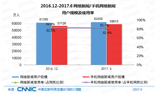 到2017年6月,我國網(wǎng)絡(luò)新聞用戶規(guī)劃為6.25億,半年添加率為1.7%,網(wǎng)民運用份額為83.1%。其間,手機(jī)網(wǎng)絡(luò)新聞用戶規(guī)劃到達(dá)5.96億,占手機(jī)網(wǎng)民的82.4%,半年添加率為4.4%。