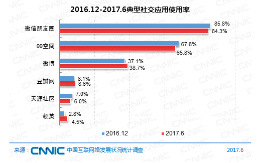到2017年6月,運用率排名前三的交際運用均歸于綜合類交際運用。微信朋友圈、QQ空間用戶運用率別離為84.3%和65.8%;微博用戶運用率繼續(xù)回升,達(dá)38.7%,較2016年12月上升1.6個百分點。筆直類交際運用中,豆瓣用戶運用率為8.6%。