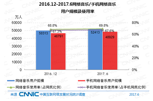 到2017年6月,網(wǎng)絡(luò)音樂用戶規(guī)劃到達(dá)5.24億,較去年末添加2101萬,占網(wǎng)民全體的69.8%。其間手機(jī)網(wǎng)絡(luò)音樂用戶規(guī)劃到達(dá)4.89億,較去年末添加2138萬,占手機(jī)網(wǎng)民的67.6%。