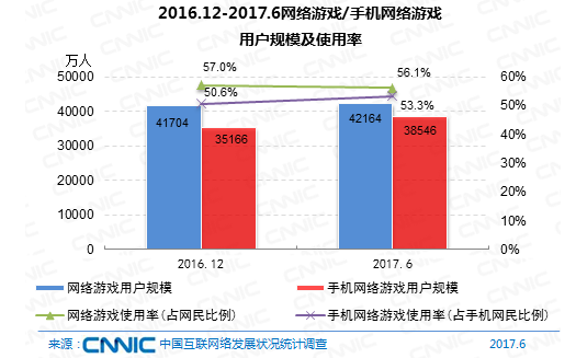 到2017年6月,我國網(wǎng)絡(luò)游戲用戶規(guī)劃到達(dá)4.22億,較去年末添加460萬,占全體網(wǎng)民的56.1%。手機(jī)網(wǎng)絡(luò)游戲用戶規(guī)劃為3.85億,較去年末添加3380萬,占手機(jī)網(wǎng)民的53.3%。