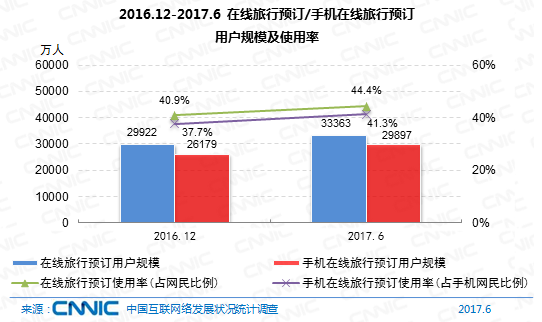 7、游覽預(yù)定網(wǎng)民規(guī)劃到達(dá)3.34億,手機(jī)端份額提高至41.3%