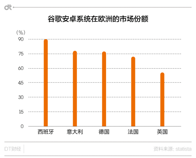可以看出,歐盟主要針對的是谷歌預(yù)裝安卓及自己軟件的行為。歐盟以為,谷歌這樣做是在抹殺規(guī)模較小的立異型應(yīng)用制造商和服務(wù)供給商。 實(shí)在,對于預(yù)裝行為的懲罰,歐盟此前也干過。2007年了解的微軟壟斷案中,歐盟就是認(rèn)定微軟濫用了其在個人電腦(PC)操縱系統(tǒng)領(lǐng)域的主導(dǎo)地位,向消費(fèi)者強(qiáng)行推廣其媒體播放器,案件的總罰款超過20億歐元。 但此次案件與之不同的是,微軟的預(yù)裝可以直接帶來銷售利潤。而安卓則是免費(fèi)的。那歐盟為何還這么擔(dān)心呢?恐怕是由于谷歌安卓在歐洲的“勢力”其實(shí)太大。 根據(jù)statista的統(tǒng)計(jì),安卓在歐洲各國的市場份額很高,在西班牙甚至達(dá)到了九成。