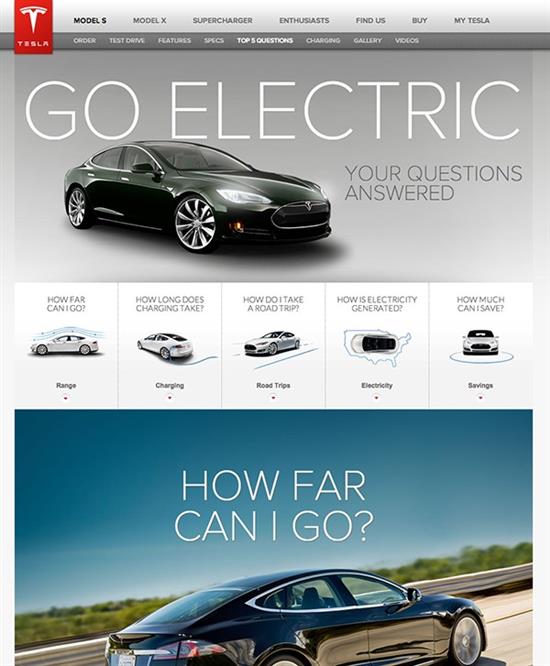 9. 交互式故事 你想把所有的內(nèi)容聚在一起嗎?假如你的品牌由一系列概念或價(jià)值(優(yōu)雅、創(chuàng)造力,簡(jiǎn)約等),從頁面布局到字體選擇,你都能通過頁面元素和交互性故事來闡述品牌和理念。如特斯拉的官網(wǎng)。