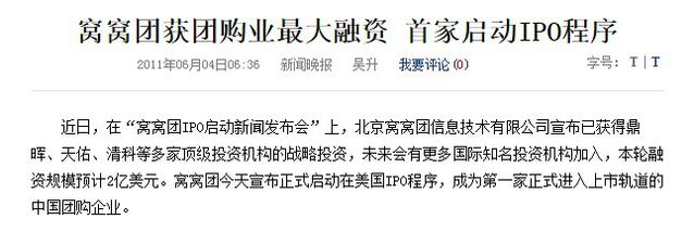 文\X教授(微信公家號:X_Man_Investment) 在大眾創(chuàng)業(yè)的背景下,初創(chuàng)企業(yè)A輪百萬、B輪C輪數(shù)千萬美金的融資新聞,已經不能在科技媒體上吸引眼球與流量了。每隔幾天,就會有此前默默無聞的公司公布進行金額聞所未聞的融資。有趣的是創(chuàng)投界的神話,往往會自我祛魅和揭穿。 虛假融資成風有強烈的內在邏輯驅動。游戲介入方甚至能得到皆大歡喜的局面。對創(chuàng)業(yè)者而言,浮夸的數(shù)額吸引眼球,能夠成為免費的公關流動,利便拉人入伙、市場拓展乃至遏制競爭對手。 對投資者而言,包裝出來的“欣欣茂發(fā)”態(tài)勢,利便擊鼓傳花的資本游戲進行下去。易凱資本創(chuàng)始人兼首席執(zhí)行官王冉,在一次演講中就說過:“一家公司融了3000萬美元,然后新聞報出來就是8000萬美元,融了1億美元報出來可能是3億美元。那既然你這么做了,他的競爭對手看到了,通常競爭對手也會采用同樣的方式。由于做乘法并不難,乘以2、乘以3基本就可以了,然后圈里知道都會這么做,又會除歸來,所以除法也并不難。” 未上市企業(yè)因不需要向公家表露企業(yè)信息,還能繼承講故事虛報融資;而一旦謀劃上市,遞交包含招股書在內的諸多文件,過去所有的融資真實情況就會暴露,尤以美股市場為甚。 只需要簡樸的英文能力,詳閱招股書,便能發(fā)現(xiàn)此間的蹊蹺。進入筆者視野的五家公司,固然間隔上市之初過去了許久,且不乏洗白成功登堂入室者,但恰是作惡者的上行下效,現(xiàn)在虛報融資額之風才越刮越烈,這也是“算舊賬”的意義所在。 有上市潛力的優(yōu)質創(chuàng)業(yè)者介入融資數(shù)額造假游戲,最為愚蠢。由于假如公司做的好,很快就會下一輪融資,而一輪要比一輪融資規(guī)模大,因此假話將一個接著一個,最后進行證券登記時,假話難圓。 出來混早晚是要還的,筆者收拾整頓的五家互聯(lián)網企業(yè):狂風科技、智聯(lián)招聘、唯品會、歡聚時代、窩窩團。有的正在遭遇訴訟,有的在被徐徐遺忘,有的雖有可稱為“傳奇”的成功,但未來將如A股走勢般兇險。 第一名: 窩窩團融資額翻4倍報道融資額:2億美元 真實融資額:5500萬美元 2011年5月,窩窩團高調公布首輪融資將達2億美元,是當年團購業(yè)內單筆融資的最大規(guī)模,融資方為鼎暉、天助、清科等。 以下為媒體報道截圖: