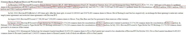 圖8:唯品會招股書顯示,唯品會在2011年4月11日獲得紅杉和DCM的實際融資金額為(3,904,865+95,283+11,974,108+25,249,636)=41,223,892美元。 |