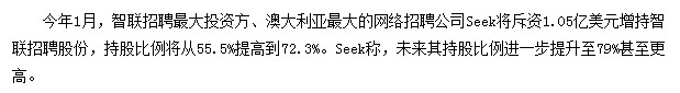 圖2:在窩窩團招股書Preferred Shares一欄中寫到,窩窩團在2011年4月的A-1輪融資中獲得了清科資本的500萬美元融資;5月和6月,鼎暉、清科分別跟投了3000萬、200萬美元;7月,Besto Holdings、天助等機構共計注資1800萬美元。2012年2月B輪融資中再獲得1250萬美元的融資。 窩窩團虛報融資是一個最具代表性的案例。窩窩團最開始向外公布上述融資動靜時,聲稱融資將來自高盛。而媒體就此事采訪高盛時,其相關負責人表示,對此事不作評論,但又建議記者,應當繼承關注這條動靜,真相會得到澄清。 高盛謹嚴克制的暗示背后,代表了窩窩團在資本市場上的潛伏危機。虛報融資這一行為,很可能導致外界在觀感上把VC/PE當成同謀,危及投資機構的信譽、職業(yè)道德。而如斯開罪資本世界中的聞名機構,其實“勇敢”。 第二名、 智聯(lián)招聘651萬美元變1億美元報道融資額:1.05億美元 真實融資額:651萬美元 2013年1月,智聯(lián)招聘二股東麥格理拋售了手中全部股份,總價約近億美元。隨后有動靜稱Seek斥資1.05億美元接手麥格理拋售的股份,同時智聯(lián)招聘官方也公然回應,稱二股東麥格理退出并非是拋售,而是大股東Seek更加看好。 在這起交易后,智聯(lián)招聘估值達到了5.58億美元。 以下為媒體報道截圖: