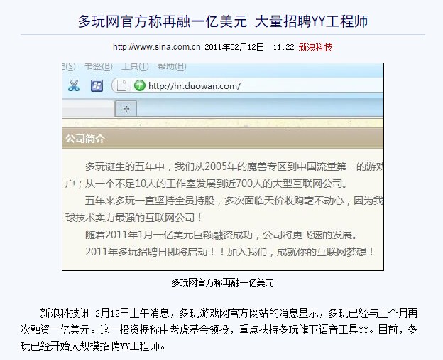 圖3:智聯(lián)招聘招股書中寫到,2013年2月28日,智聯(lián)向Seek發(fā)售3,061,591股普通股,價值僅32.9141萬美元;2013年10月31日,智聯(lián)又向Seek增發(fā)6,488,409股普通股,價值為528.4834萬美元。兩次合計注資約561萬美元。 第三名、 歡聚時代強調2300萬報道投資額:1億美元 真實投資額:7700萬美元 2011年2月,多玩網曾公布獲得1億美元融資,這一投資由老虎基金領投。 以下為媒體報道截圖: