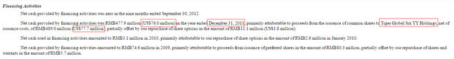 圖4:2011年8月,YY曾三次向老虎基金發(fā)售普通股共計7500萬美元。