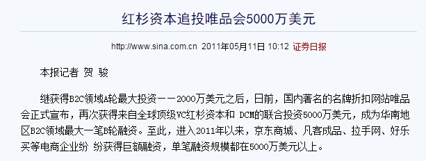 圖7:2007年7月26日,B輪融資,向IDG增發(fā)B輪優(yōu)先股5,643,990股,每股0.8859美元,對價為500萬美元。 第五名、 唯品會灌水近900萬報道融資額:5000萬美元 真實融資額:4120萬美元 2011年5月,唯品會公布獲得紅杉資本和DCM的聯(lián)合風險投資5000萬美元。有趣的是,為了能給自身項目冠以“最大的”稱號,公關部分使用了“華南地區(qū)”這樣的定語。 以下為媒體報道截圖: