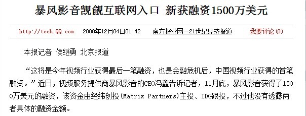 圖5:在招股書financingactivities一欄可以看出,截止到2011年12月31日,YY所有融資金額主要來自老虎基金的7770萬美元。 由圖4也可看出,YY并不止一次虛報融資額。在2009年,YY稱獲2300萬融資,但招股書顯示2009年12月獲C-1輪融資143.9萬美元,C-2輪融資1050萬美元,共計1193.9萬美元,僅為報道融資額2300萬美元的一半。 四、 狂風科技融資金額600萬變1500萬報道融資額:1500萬美金 真實融資額:600萬美金 創(chuàng)造了40多個漲停紀錄的狂風科技,在近期股市持續(xù)震蕩大跌之前卻“神奇”停牌,目前股價還保持高位?耧L曾多次謀求登陸美股未果,無奈拆VIE后回歸海內,卻成就了“妖股”,但這時代的幸運兒,也有“黑歷史”。 2008年12月,狂風影音CEO馮鑫公布前一個月獲得1500萬美元融資,由經緯創(chuàng)投主投、IDG跟投,當時的媒體報道截圖如下: