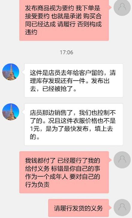 1元搶購成功賣家拒不發(fā)貨 當(dāng)天1元搶購成功后,陳同學(xué)很快收到了巴黎時尚風(fēng)向標(biāo)店鋪發(fā)來的動靜,賣家表示商品已經(jīng)賣出無法給陳同學(xué)發(fā)貨,同時表示,這件衣服的價格并不是1元,是為了最快發(fā)布才填上去的。 ![]()