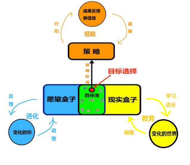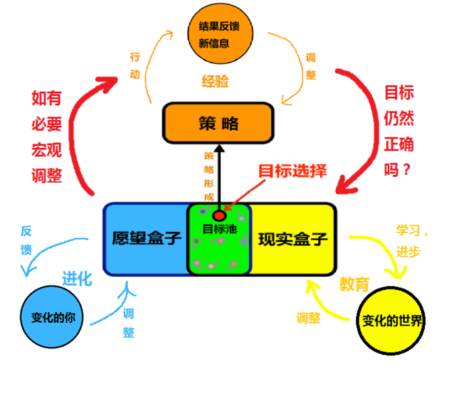對于所有這些部門來說,盒子代表了目前的假說,圓環(huán)代表了可以被用來調(diào)整這些假說的新信息源。我們必需記住,這些圓環(huán)才是大頭,而非這些盒子——這些盒子只是盡己所能的讓圓環(huán)驕傲。假如我們和圓環(huán)內(nèi)容脫節(jié),盒子中的信息就會過期,無法有效支持決議計劃制定。 讓我們撤退退卻一步,把軟件視為一個整體。我們看到,下面是目標(biāo)形成機制,上面是目標(biāo)達成機制。實現(xiàn)目標(biāo)通常需要精準聚焦。你需要放大微觀圖像,全新投入到目標(biāo)當(dāng)中,制定策略,瞄準它。 但是,跟著時間推移,愿望之盒和現(xiàn)實之盒會調(diào)整自己的內(nèi)容,改變自己的形態(tài),終極,其他情況發(fā)生了——目標(biāo)池變了。 目標(biāo)池正好是愿望之盒和現(xiàn)實之盒發(fā)生重疊的地方,其外形和內(nèi)容完全取決于這些盒子的狀態(tài)。當(dāng)你糊口在位于上方的目標(biāo)達成機制中時,確保你的奮斗的對象與下方的目標(biāo)池繼承保持一致,這很重要。——所以,讓我們再加上兩個大的紅箭頭: