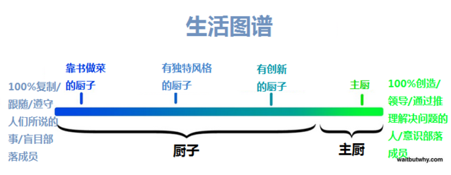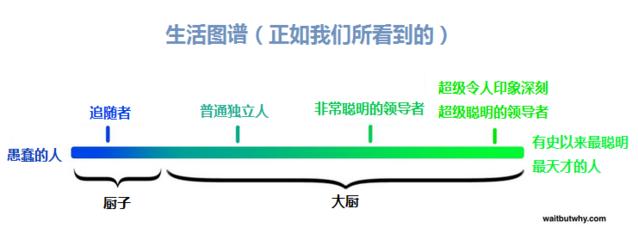 但我很肯定,大多數(shù)人看見這張光譜圖時,他們以為自己在其中的位置遠比實際位置靠右。通常,我們比自己以為的更像廚子——只不外從自身的立足點看不見這個真相。 好比說: 從定義上說,廚子是追隨者。他們之所以是廚子,恰是由于不管他們做什么事,都在追跟著某種菜譜。但是,我們中的絕大多數(shù)人并不以為自己是追隨者。 我們以為,追隨者是沒有自己思惟的怯夫。我們老是想著自己的領(lǐng)導(dǎo)地位、工作積極性,并且,我們不可能讓朋友們對我頤指氣使。我們把這些當(dāng)做自己不是追隨者的證據(jù),從而證實自己不僅僅只是一個廚子。 但題目是——以上這些事情只能證實,你在你的群體中不是追隨者。正如愛因斯坦所說: 要成為一個羊群的完美成員,你首先要成為一只羊。 也就是說,你在自己的世界或社會階層中或許被看做一個明星或領(lǐng)導(dǎo)者,但是,如果你當(dāng)初以此為目標(biāo)的首要原因恰是由于你的群體菜譜告訴你,這是一件重要的事,它能讓群體的其他成員為你折服和仰望你,那么,你就不是一個領(lǐng)導(dǎo)者——你只是一個超級成功的追隨者。再如愛因斯坦所說,你和那些折服于你的人一樣,都未闊別廚子。 為了獲得真相,你必需把鏡頭拉遠,直到你能看到廚子的領(lǐng)導(dǎo)者——菜譜。 然而,當(dāng)我們面臨自己的糊口時,我們并不善于縱觀全局。反而是糾結(jié)于細節(jié),那看似唯一無二的獨立自我可能只是一個視錯覺。有時你感覺自己在獨立推理,但當(dāng)把鏡頭拉遠時,你才會發(fā)現(xiàn),原來你只是在別人定好步驟的棋盤上玩「連連看」。你感覺自己是個有原則的人,但實際上那只是你所在的群體的普遍原則。你覺得自己很有主見,但或許那只是父母、媒體、朋友、宗教或名人灌注貫注給我們的觀點。你感覺你自己選擇了自己的人生道路,但實際上只是一條提前設(shè)好的、并經(jīng)由了群體一致同意的黃磚路。你覺得你在《秘密花園》里施展創(chuàng)造力——但請留意,顏色不要涂到線條外面。 因為這些視錯覺的存在,我們看不見自己思索中的缺陷,也無法辨認出真正的思惟家,即便他泛起在我們眼前。相反,當(dāng)一個在科學(xué)思維和獨立思索上技壓群雄的大廚(如馬斯克、喬布斯或愛因斯坦)泛起時,我們把他們的成功歸因于什么呢? 他們的硬件真他媽的了不起。