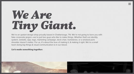 2014年,字體在很多網(wǎng)站設(shè)計中施展重要作用,我未發(fā)現(xiàn)這種趨勢在短期內(nèi)改變的跡象?墒2015年,我看到網(wǎng)站中的標(biāo)題和字體變得越來越大。夸張地說,就連天上的飛機(jī)可能都能看到地面上的字。當(dāng)你訪問Tiny Giant的網(wǎng)站時,你會看到很大的字體。這實際上是一種聲明,讓你很難錯過。大字體將繼承在2015年的網(wǎng)站設(shè)計中施展重要作用,成為確保進(jìn)步訪客視覺層次的方法。訪客首先會看到最大的字體,由于那會首先吸引你的留意力。