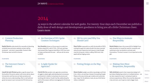 響應(yīng)式網(wǎng)站設(shè)計已經(jīng)流行了一段時間,可是直到近來,大多數(shù)網(wǎng)站設(shè)計重點都放在令網(wǎng)站在桌面設(shè)備上看起來更好,而在手機(jī)或平板設(shè)備上看得過去即可。不管何種設(shè)備,響應(yīng)式網(wǎng)站設(shè)計正邁向更好體驗。我們正看到這種設(shè)計元素向移動設(shè)備上轉(zhuǎn)移,并在更廣泛地使用。好比24ways與Rawnet都展示了這種觀念,將類似應(yīng)用和響應(yīng)式菜單添加到整個網(wǎng)站中,而不僅僅有更小視口的設(shè)備上。在這種情況下,這兩家網(wǎng)站選擇靠左或靠右的垂直菜單,而不是位于頂部的水平菜單,使用起來更像彈出/滑出應(yīng)用式菜單,這種技術(shù)答應(yīng)網(wǎng)站應(yīng)用與響應(yīng)式設(shè)計泛起在更小的視口上。