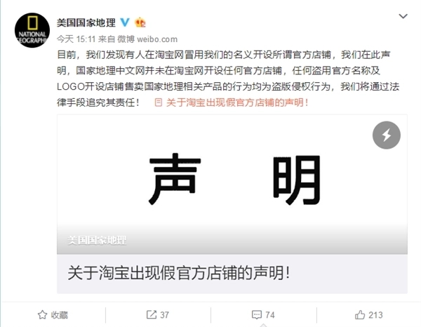 12月6日,美國國家地理官方微博發(fā)布聲明稱,淘寶有店肆盜用自己的Logo,出售盜版日歷,將會通過法律手段保護(hù)公司的權(quán)益和利益。