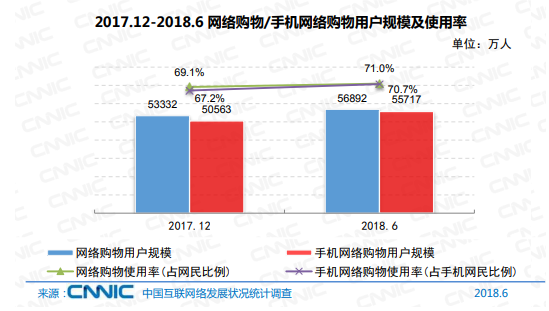 到2018年6月,我國網(wǎng)絡購物用戶規(guī)劃到達5.69億,相較2017年底增加6.7%,占網(wǎng)民整體份額到達71.0%。