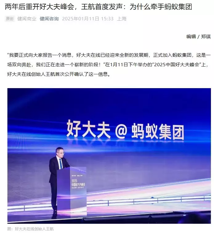 2025 年 1 月 11 日,在 “2025 好大夫峰會” 上,螞蟻集團(tuán)與好大夫在線在收購?fù)瓿珊笫锥韧_亮相,并發(fā)布了醫(yī)療服務(wù) “AI 助理”。以下是相關(guān)詳細(xì)信息: