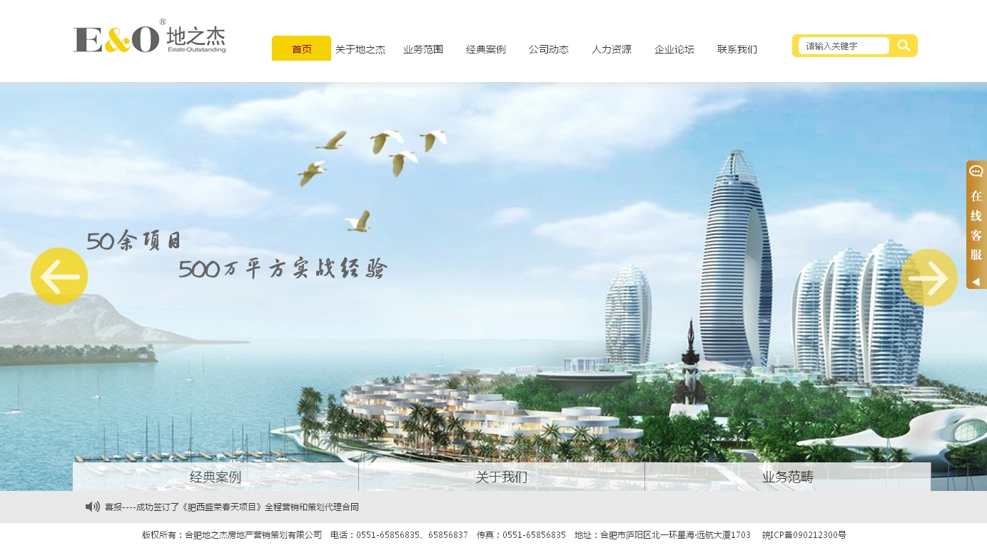 合肥地之杰房地產営銷策劃有限公司成立于2007年.公司自成立以來,始終把自己定位于專業(yè)地產顧問 公司:以合肥立足點專注地為安徴二.三線城市地產商服務.此務范圍涵兼住宅地產,商業(yè)地產以及體育、 休閑、旅游等綜合類地產:業(yè)務領域渉及到前期投資咨詢、開發(fā)顧問、產品規(guī)劃設計踴問、銷售代理.銷售回 款廣告策劃與推廣活動組織與執(zhí)行,物業(yè)顧問等地產開發(fā)投資十幾個環(huán)節(jié)•合肥地之杰努力做安徽本 土領先的地產綜合服務商!