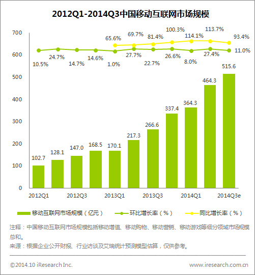 艾瑞咨詢數(shù)據(jù)顯示,2014年第三季度中國移動互聯(lián)網(wǎng)市場規(guī)模達到515 6億元,環(huán)比增長11 0%,同比增長93 4%。移動互聯(lián)網(wǎng)市場經(jīng)由近幾年的快速